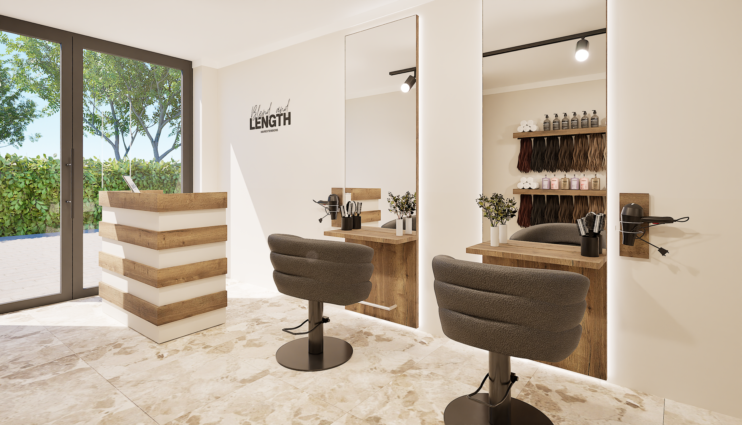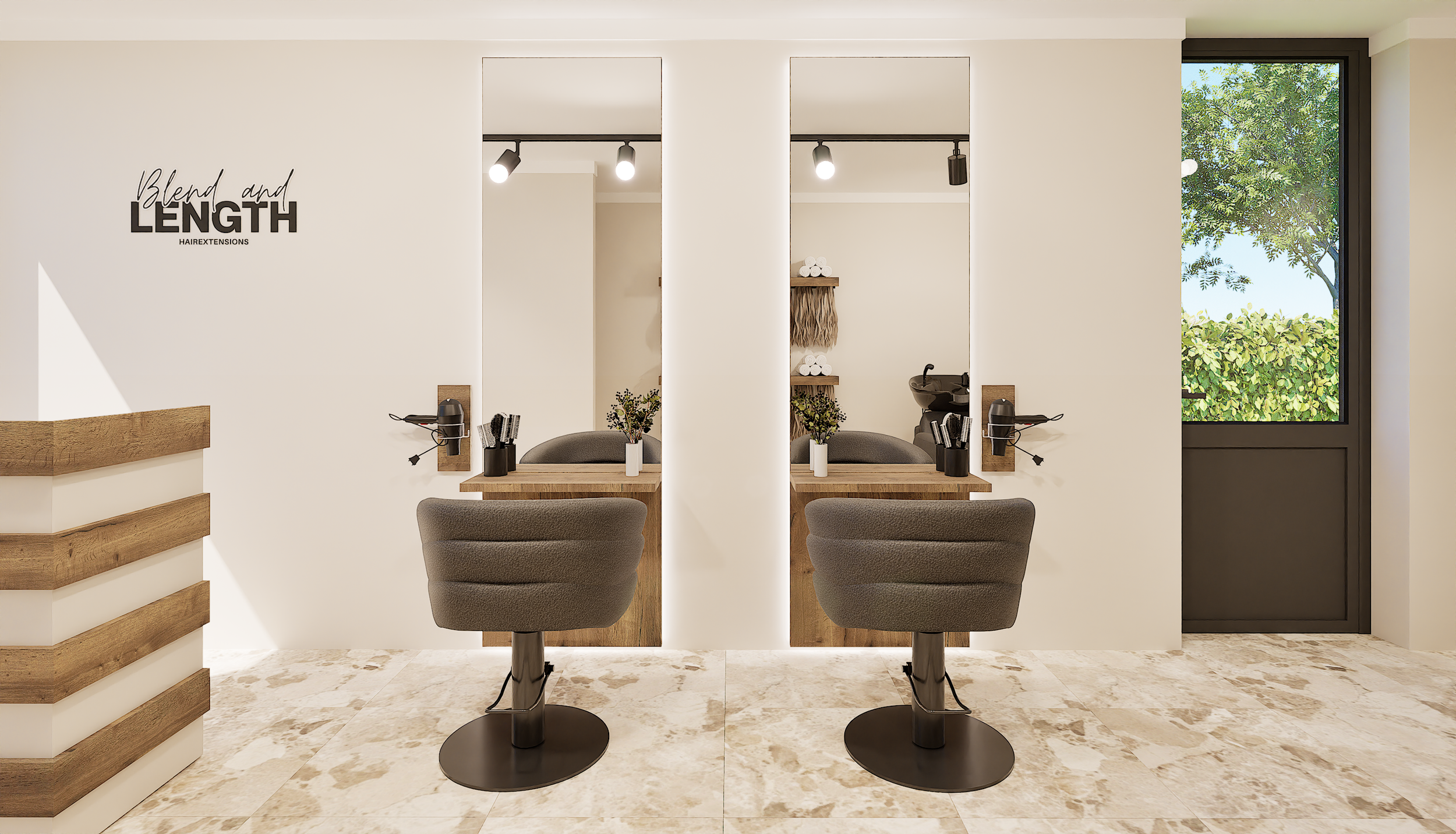 Voor dit project heb ik de klant mogen helpen met het ontwerpen en visualiseren van een nieuwe haarextensions salon. Het resultaat is een luxe en rustige salon met warme beige tinten als basis. De ruimte straalt elegantie en professionaliteit uit, waarbij een comfortabele sfeer voor klanten centraal staat. Daarnaast is er aandacht besteed aan een logische indeling, zodat werkplekken efficiënt worden benut en het geheel een open en uitnodigende uitstraling krijgt.